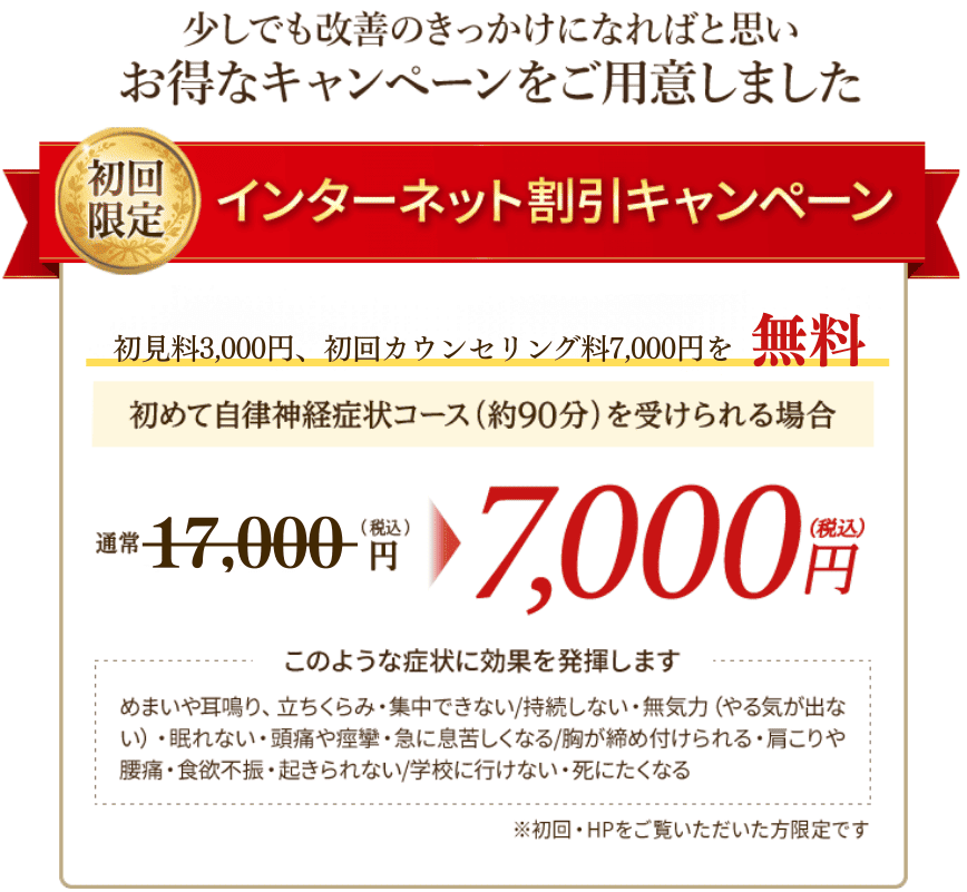 ※ご確認ください※ 初めて自律神経調整コースを選択される場合、予約表内の枠が40分で表示されますが、ご予約時には自動的に初診割引適応の90分枠となります。 |
